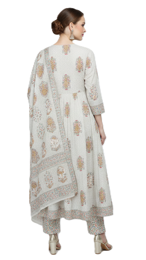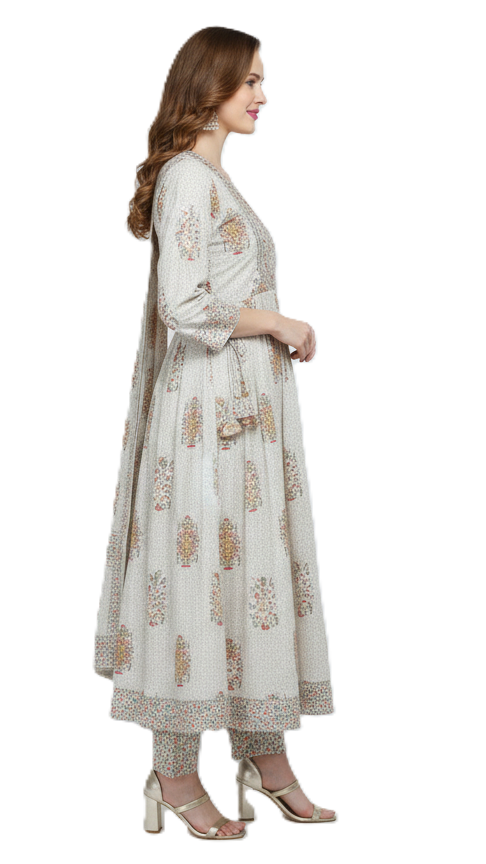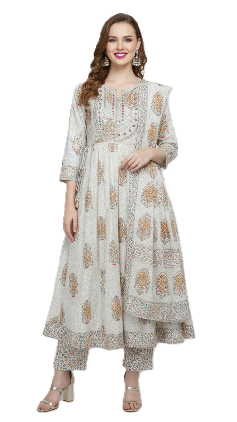 - Complete 3-Piece Set: Includes a full-length Anarkali kurta, coordinated printed trousers, and a matching dupatta.