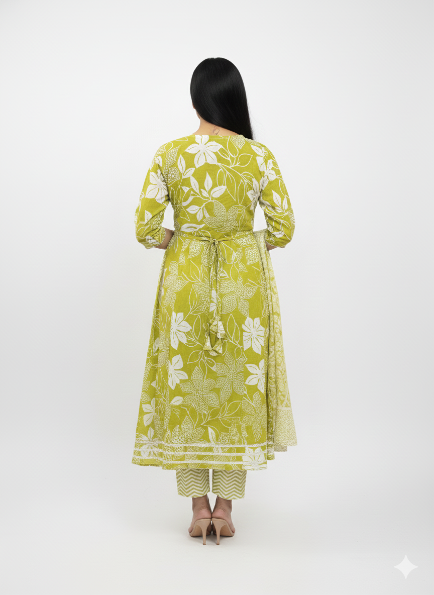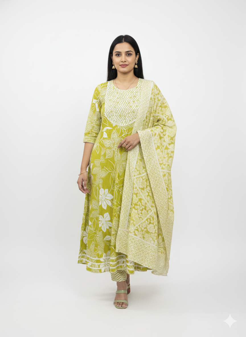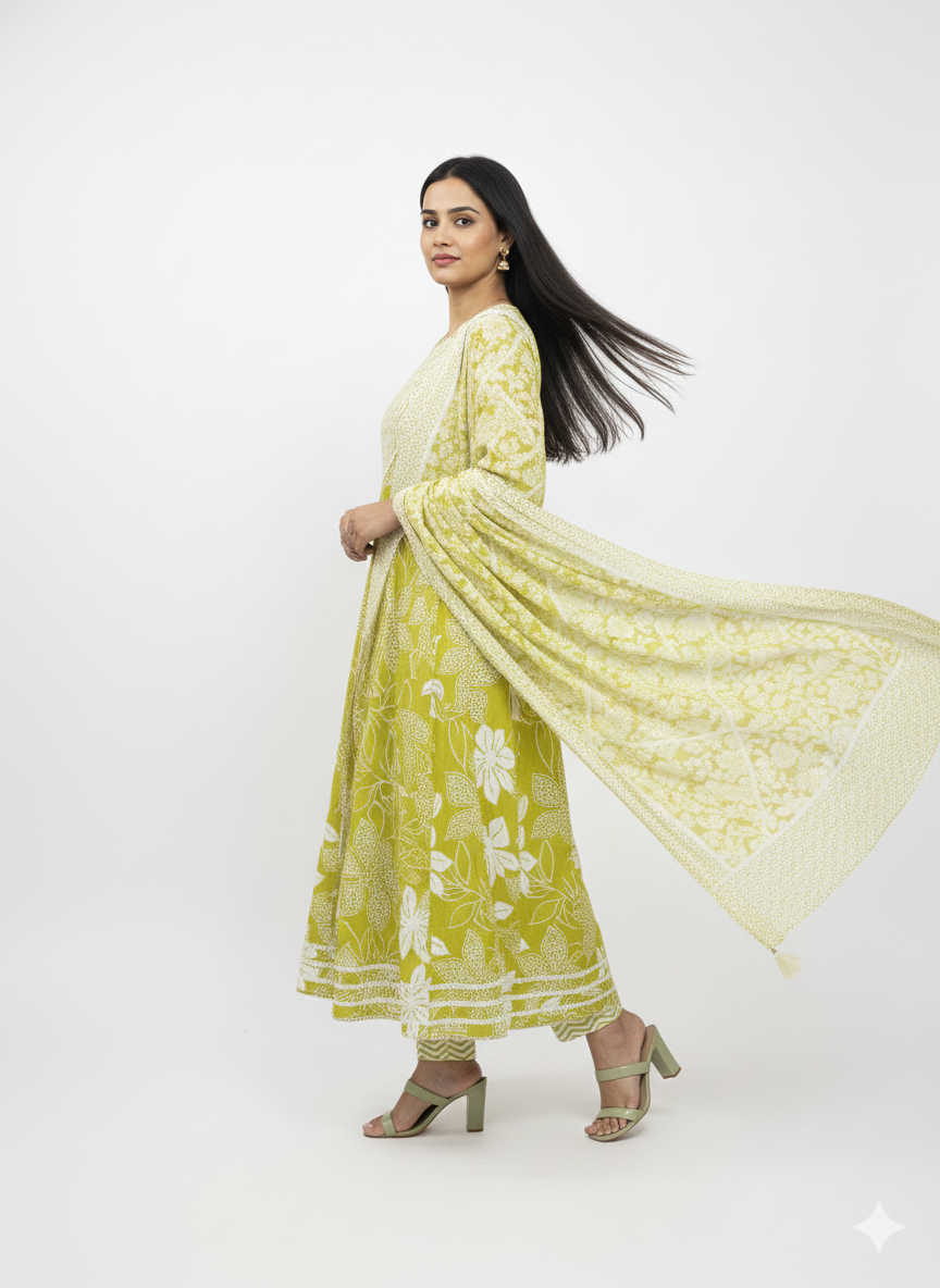 Elevate your ethnic wardrobe with this absolutely stunning and one-of-a-kind Lime Green Floral Anarkali Kurta Set. Crafted from a comfortable mix cotton fabric, this ensemble is designed to offer a perfect blend of style and comfort, making it a versatile choice for any occasion.