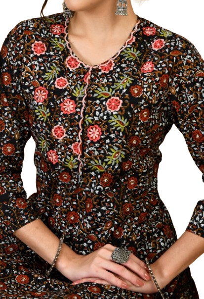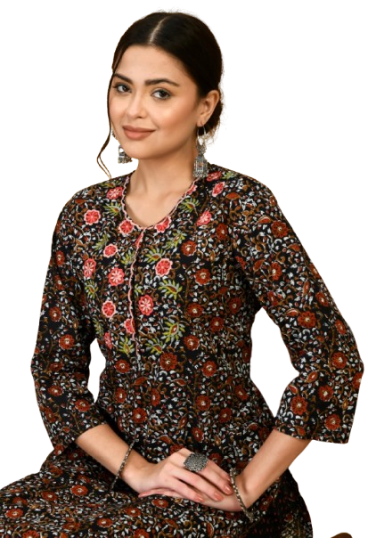 Beat the heat in style with our hand-embroidered high-low dress, expertly crafted from 100% pure cotton for ultimate breathability and comfort. This unique Indo-Western fusion dress combines: