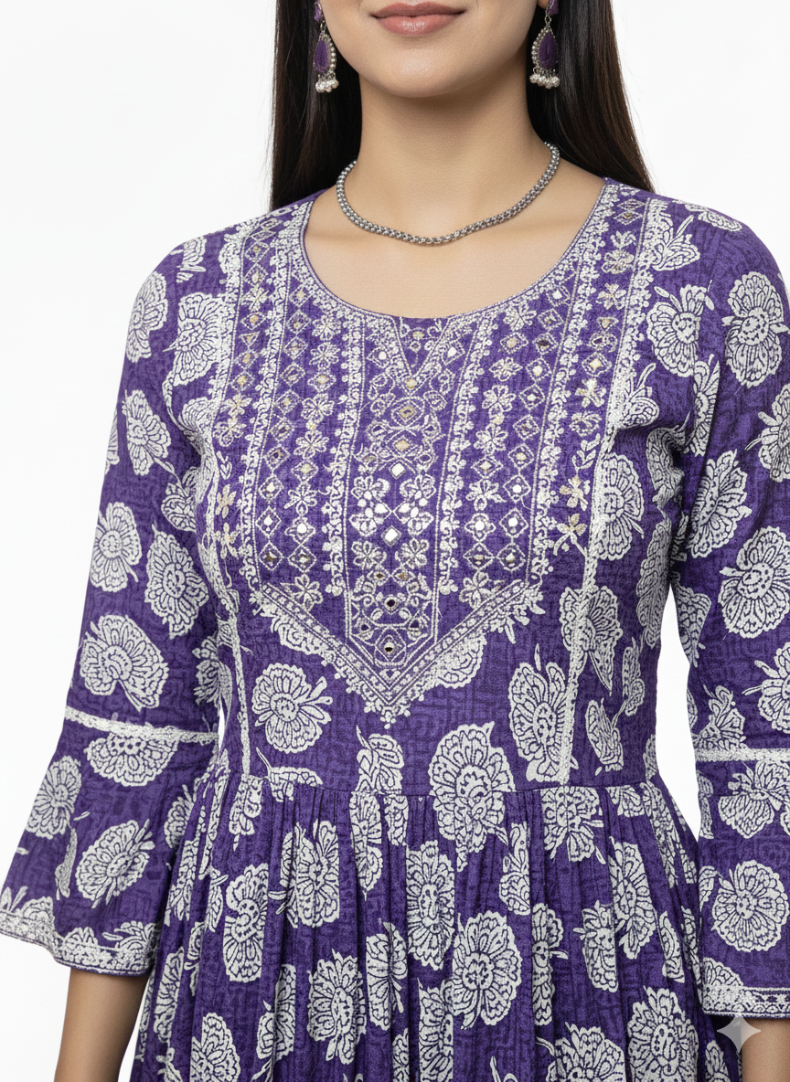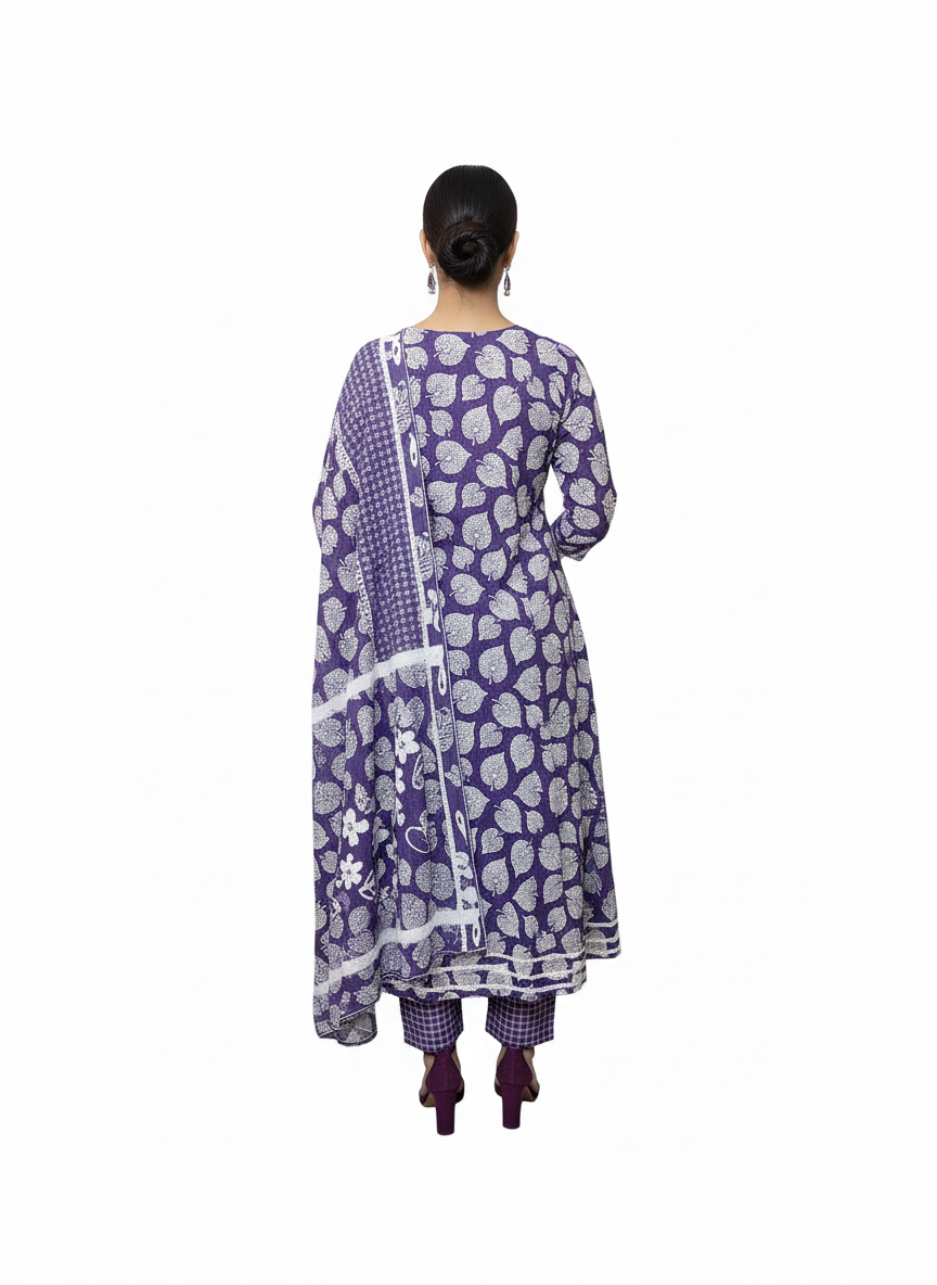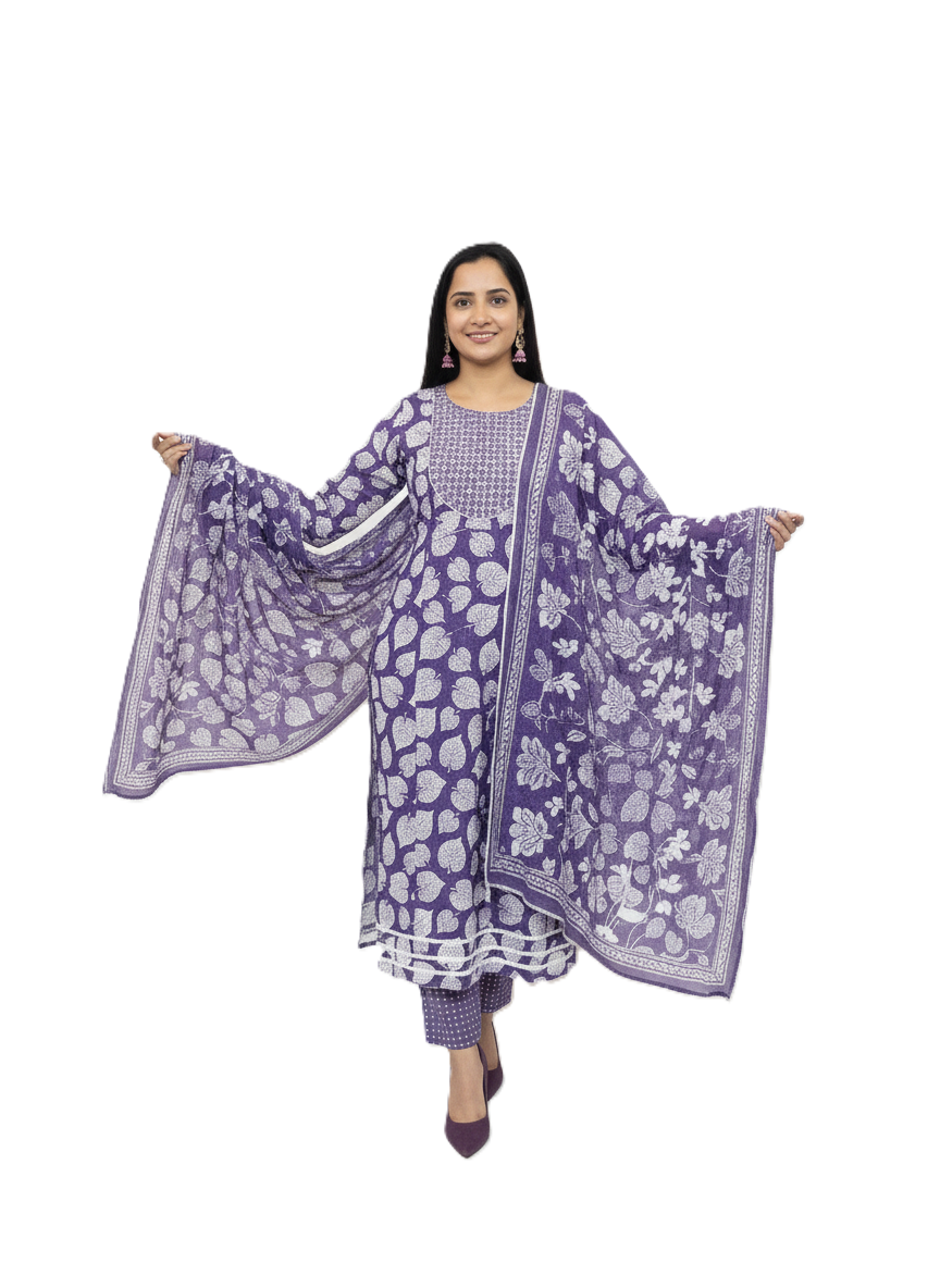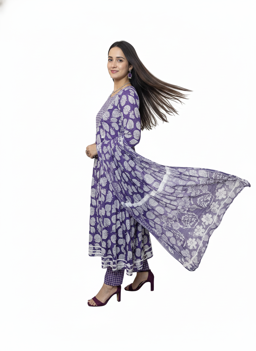 Step into elegance with this stunning and one-of-a-kind A-Line Anarkali-style suit set, crafted from a comfortable mix cotton fabric. Its trendy purple hue, complemented by the striking white print, makes it perfect for day or night time events.