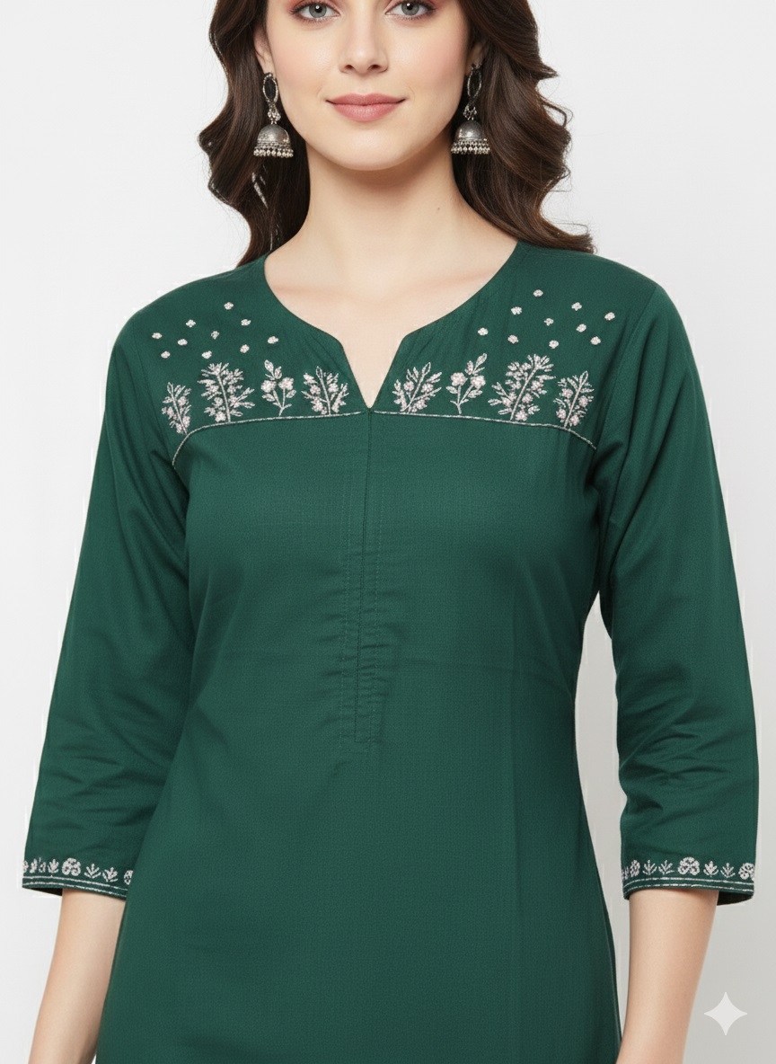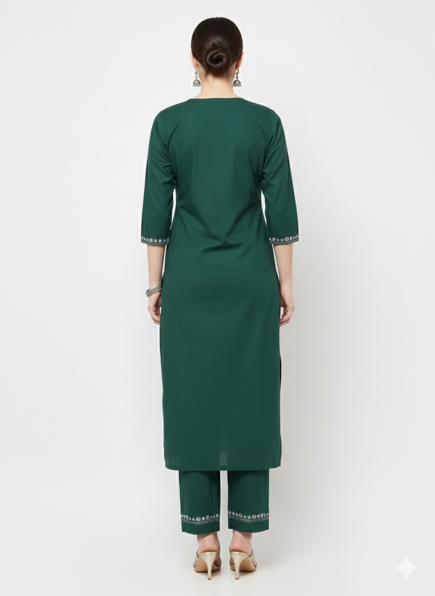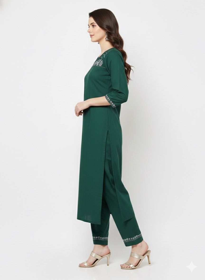 - COORDINATED BOTTOMS: Comes with matching emerald green straight-fit trousers. The trousers are finished with the same beautiful embroidery at the hem, creating a cohesive and polished designer look from top to bottom.